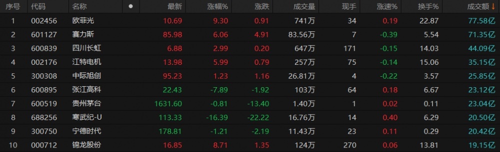 沪深两市半天成交额4415亿元,较上一交游日同时缩量280亿元。个股方面,铁心午间收盘,欧菲光成交额名交替一,达77.58亿元;赛力斯、四川长虹、江特电机、中际旭创成交额相通居前,区别为71.35亿元、44.09亿元、35.15亿元、25.85亿元。