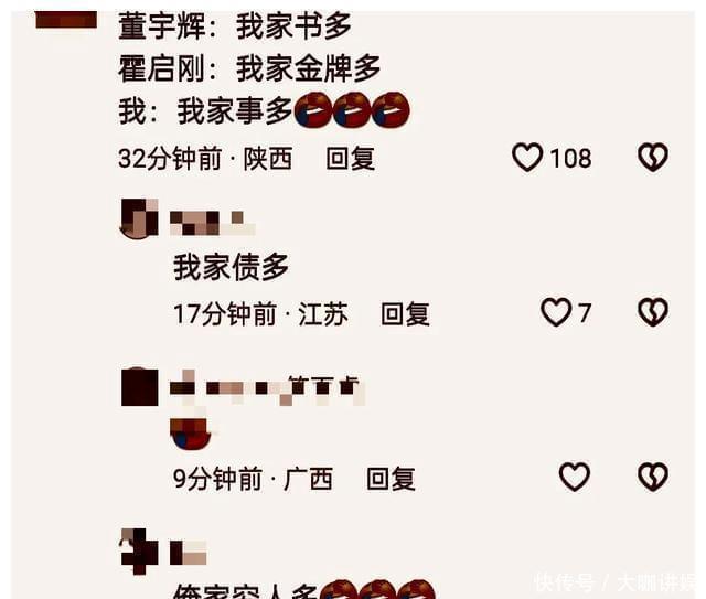 这位网友是这么整理的,董宇辉:我家信多。霍启刚:我家金牌多。霍启刚:我家里有郭晶晶。董宇辉:呃,这个……那啥?导演,访谈欺压了没?