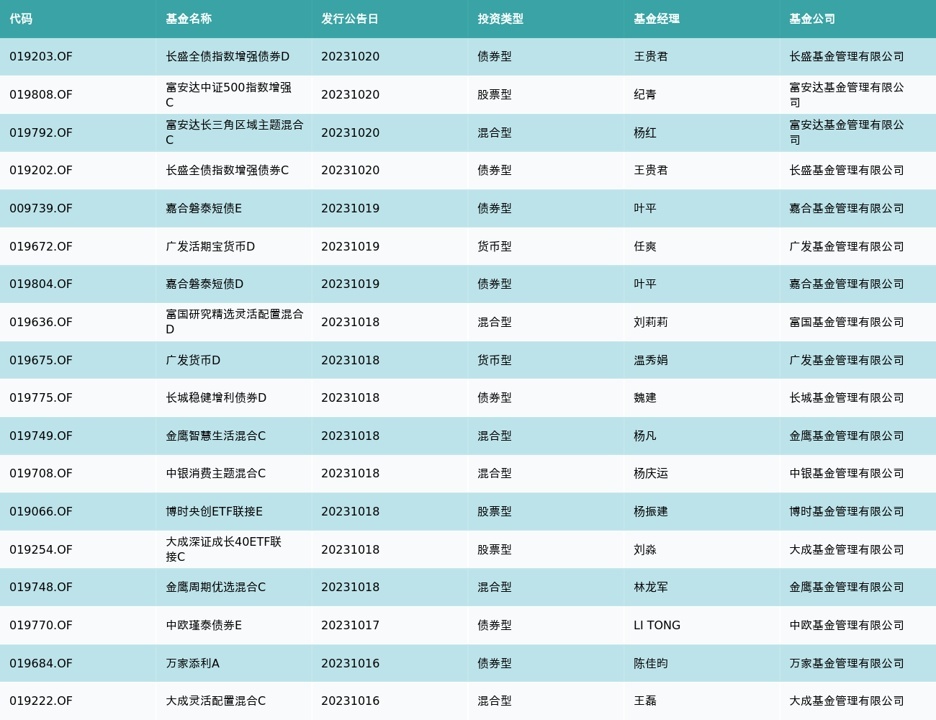 上周有18只新基金刊行,辞别为:长盛全债指数增强债券D、富安达中证500指数增强C、富安达长三角区域主题搀杂C、长盛全债指数增强债券C、嘉合磐泰短债E、广发活期宝货币D、嘉合磐泰短债D、富国商讨精选生动成立搀杂D、广发货币D、长城谨慎增利债券D、金鹰机灵生存搀杂C、中银花消主题搀杂C、博时央创ETF集合E、大成深证成长40ETF集合C、金鹰周期优选搀杂C、中欧瑾泰债券E、万家添利A、大成生动成立搀杂C,笃定见下表: